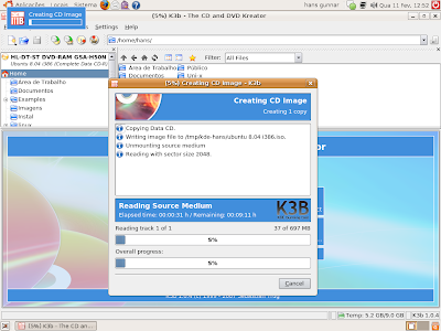 Depois de pronto (som característico do K3b de gravação com sucesso), procurar o arquivo extraído em: /tmp/kde-“seu nome de usuário”, selecione o arquivo .iso e faça uma cópia para sua pasta desejada, pois ao reiniciar o micro, por padrão de configuração, o K3b apaga toda a pasta de destino das imagens por ele criadas.
